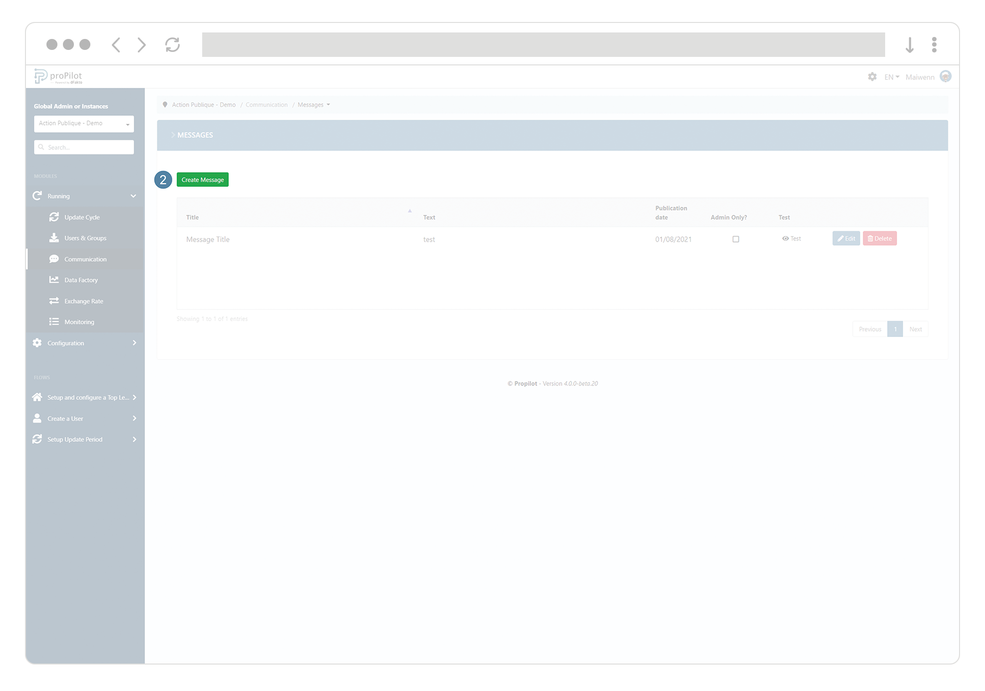 Click on the "messages" tab. You will be able to create a new message and see the messages configured for your instance.