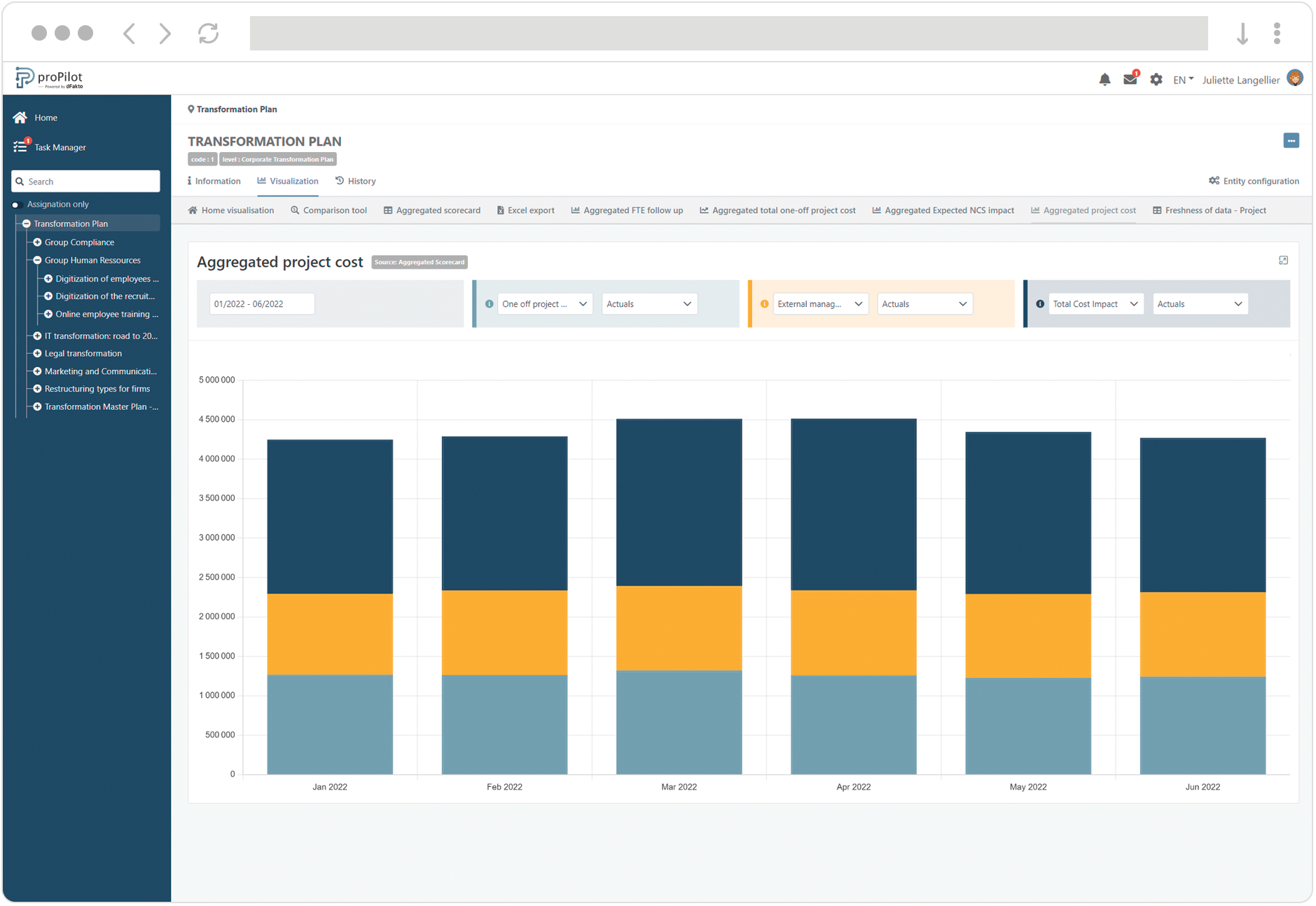 This visualization allows to graphically display the indicators collected in the scorecard. You can select the data source to display either the scorecard of the entity or the aggregated values of the indicators, if the current entity is located at a superior level in the structure.