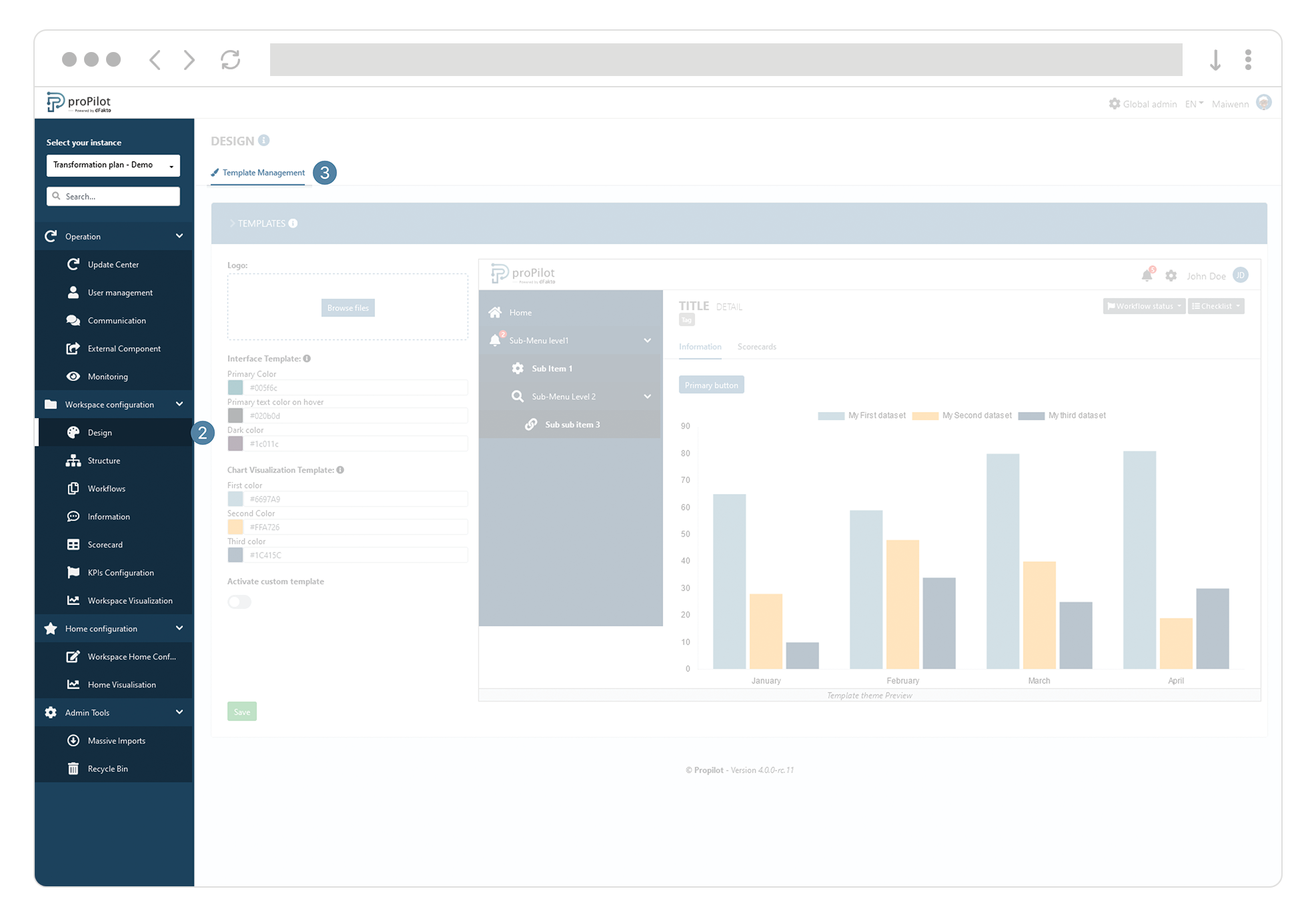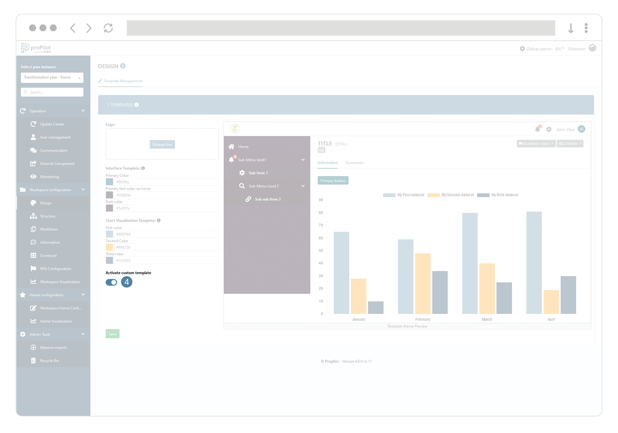 The update of the visual rendering impacts all the workspaces of the instance. In order to check which workspaces will be impacted, just click on the drop-down menu (top left of the screen). You will then be able to see the list of workspaces, related to the instance, affected by this change.