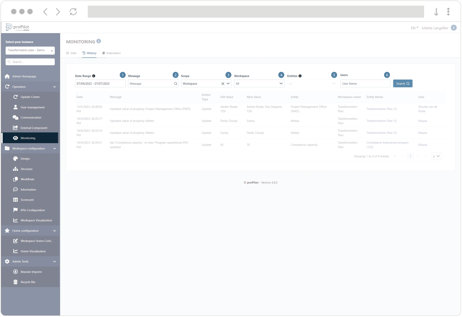 Compliant with the most demanding security and audit criteria, your proPilot platform keeps track of the modifications made. The audit scope is guaranteed through a dedicated interface. These tools are made accessible based on user and/or administrator scope.