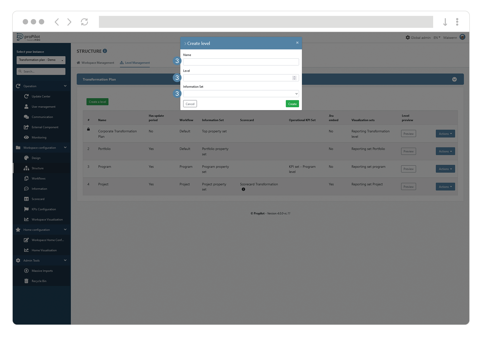 For each workspace, it is possible to define several levels as well as a number of associated qualitative and quantitative information.