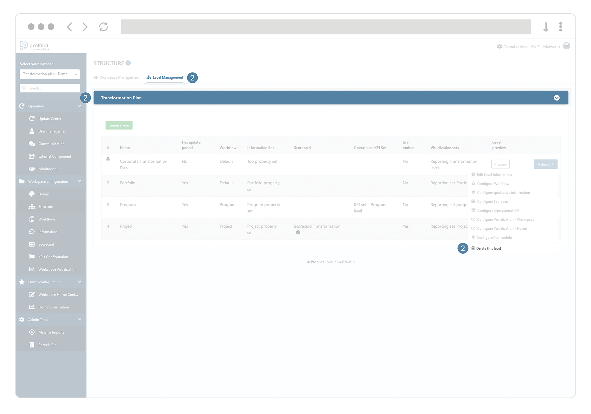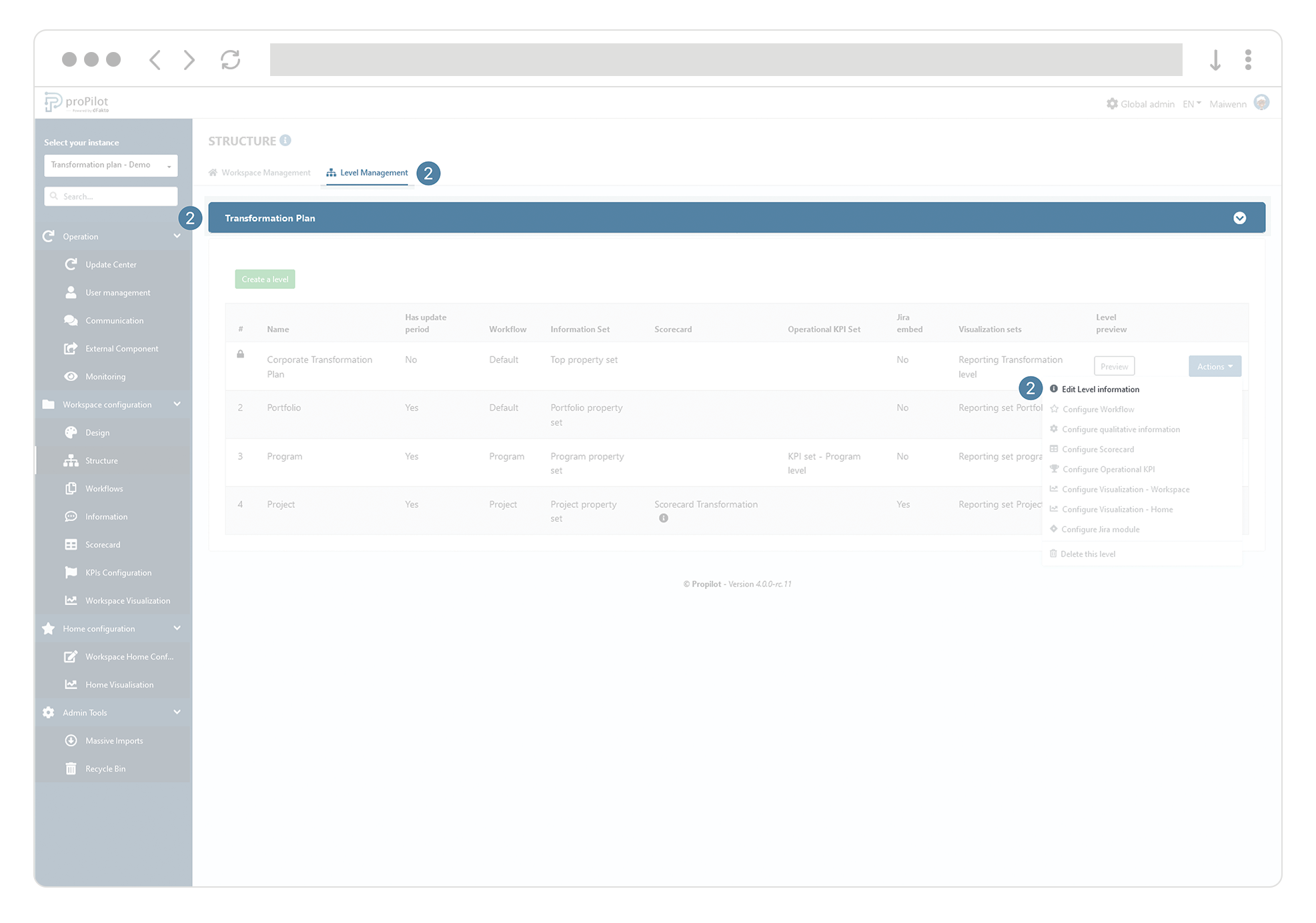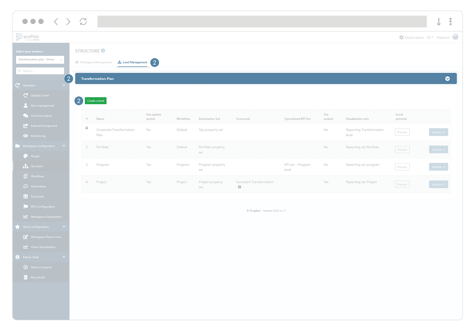 Open the "Level management" tab and, select the applicable workspace within the instance (if applicable).