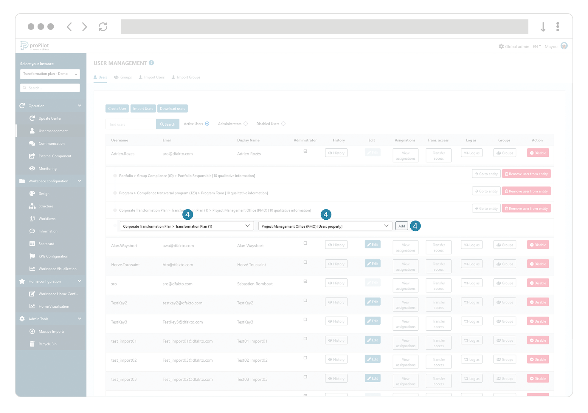 In SSO mode, you can pre-configure a user in proPilot in order to assign them admin rights or responsibilities for entities in advance.