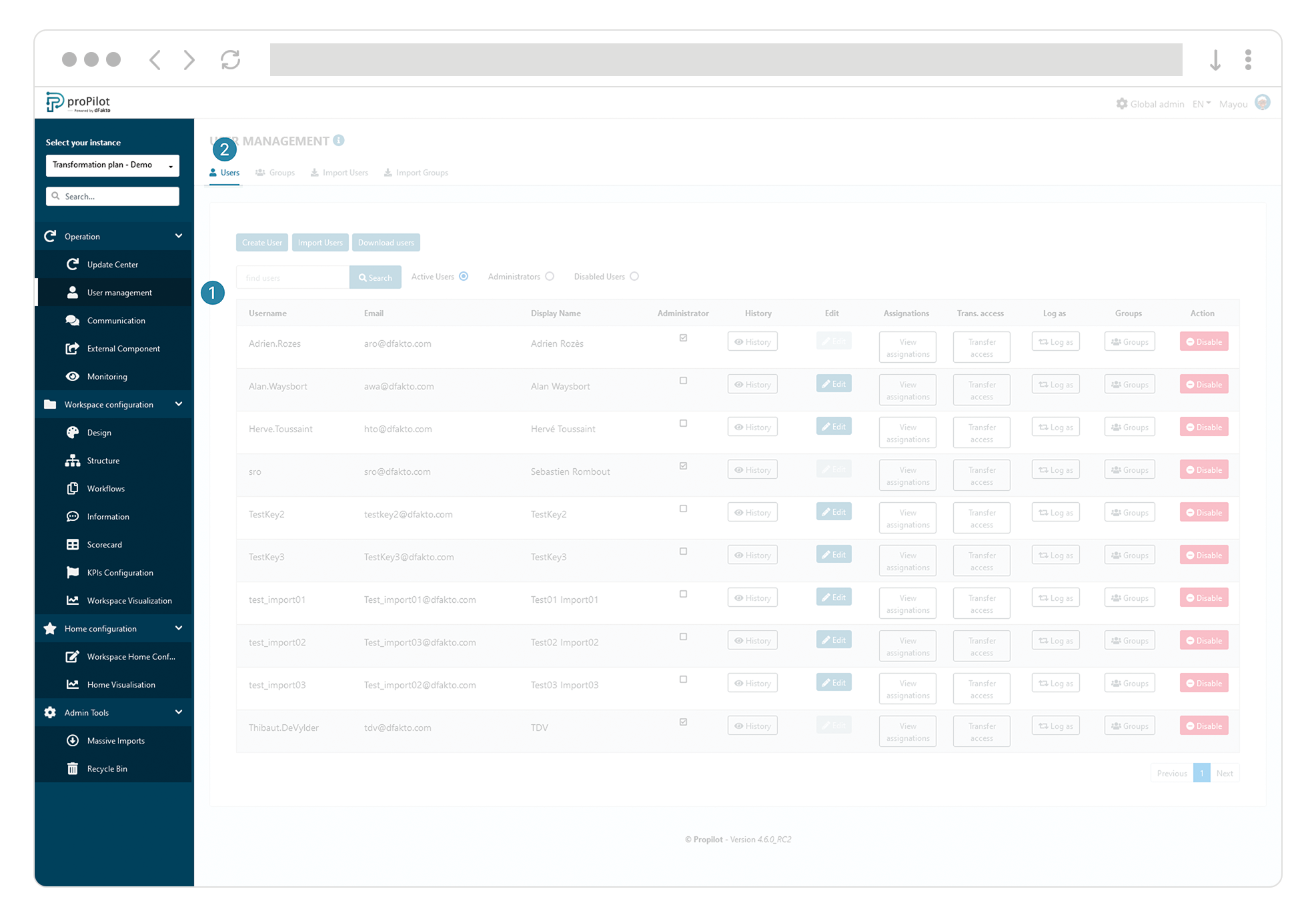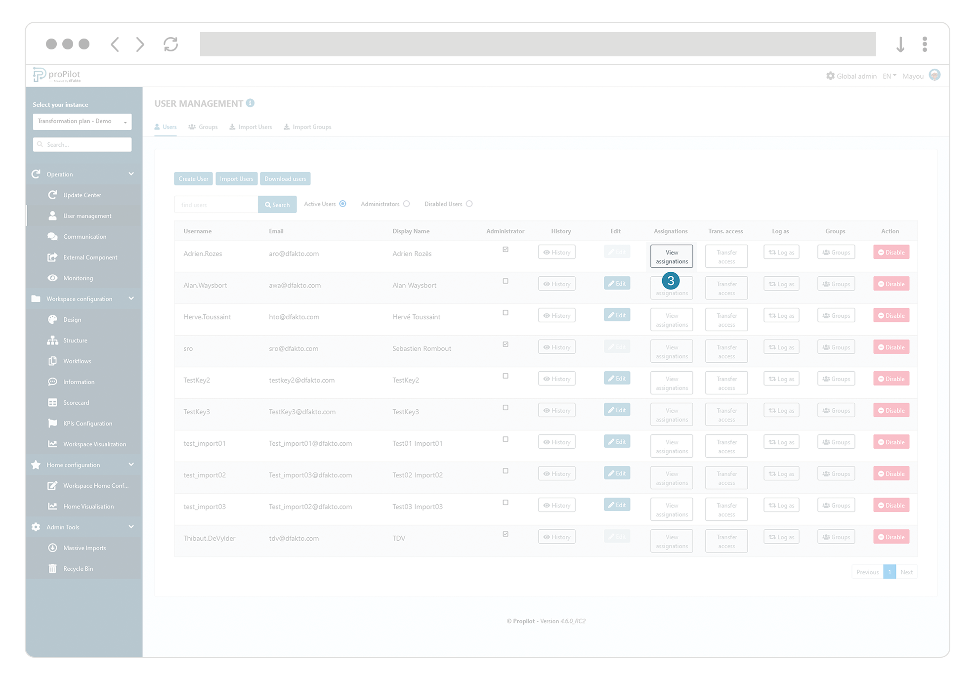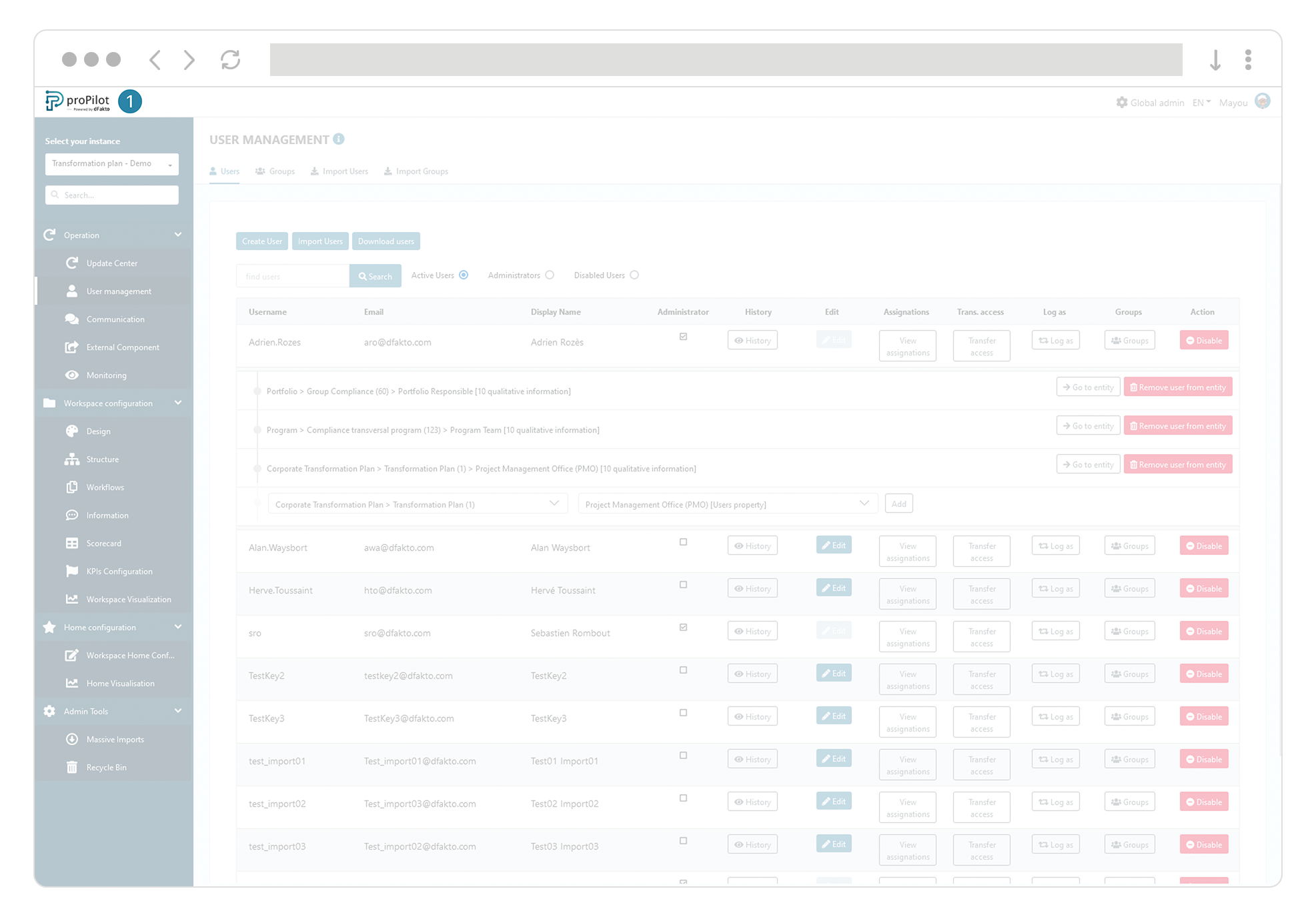 If the user was not pre-created, their account will be created in proPilot at the time of their first SSO login; the user will then appear in the administration user list. By default, they will not have any rights or assignments on their first login.