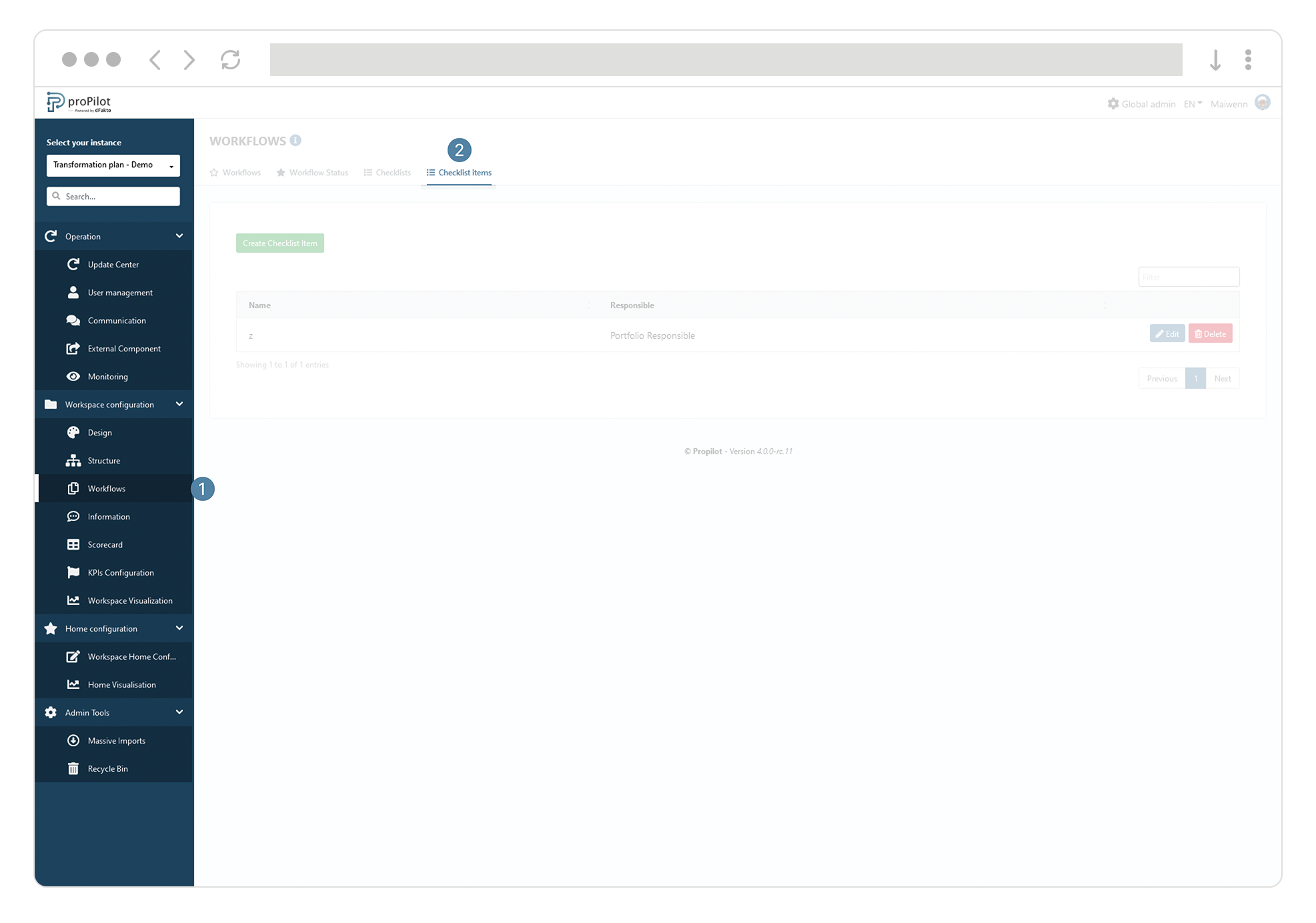 For example, in order to move an entity (such as a project) from an "in progress" status to a "closed" status, it is possible to set certain conditions in a dedicated checklist. At the time of the status change, the user will be asked to validate the required elements of this list to be able to change the entity to "closed" status.