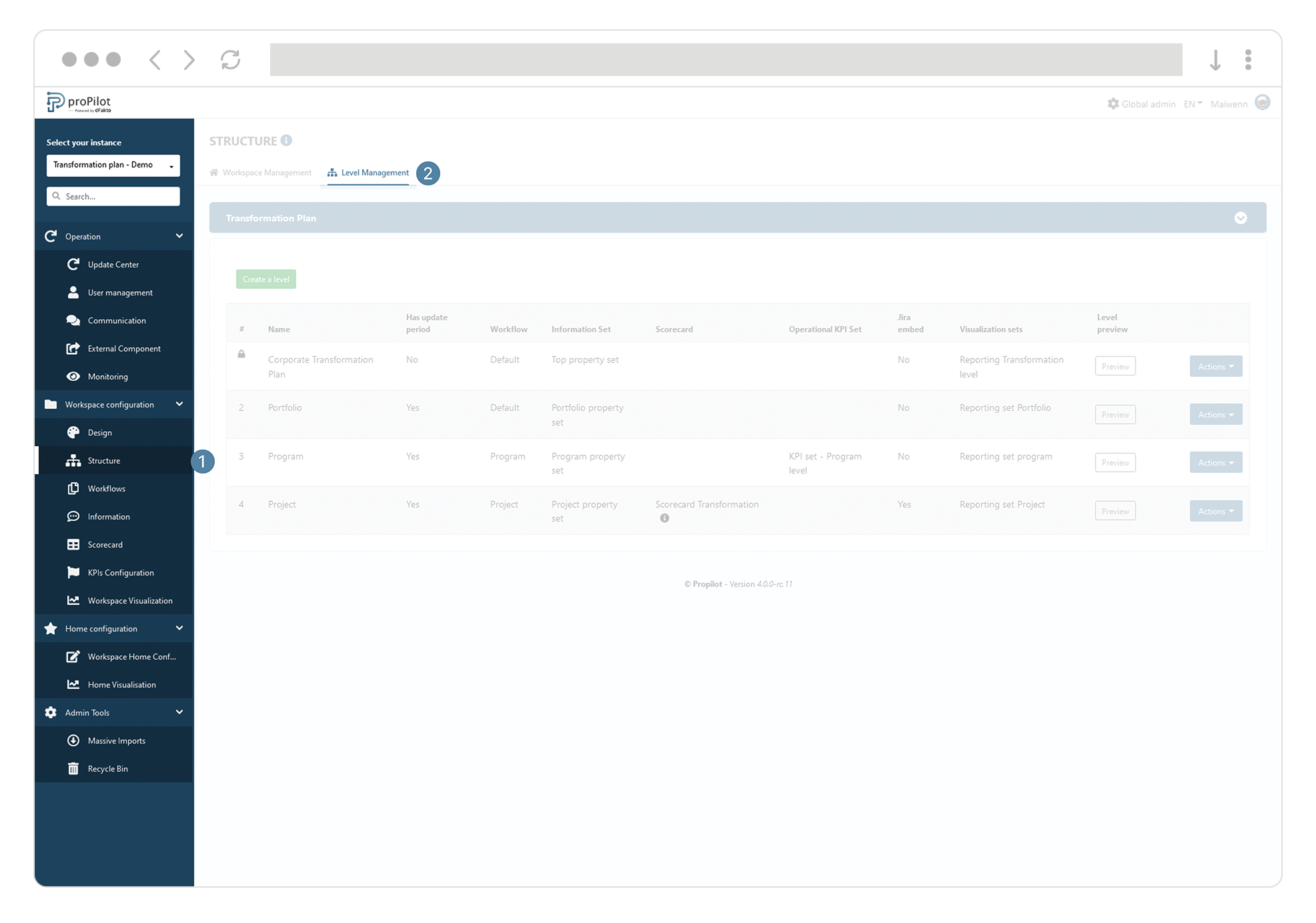 Click on the "Level Management" tab and select the workspace you wish to update. This module allows you to manage the levels and their respective configurations.