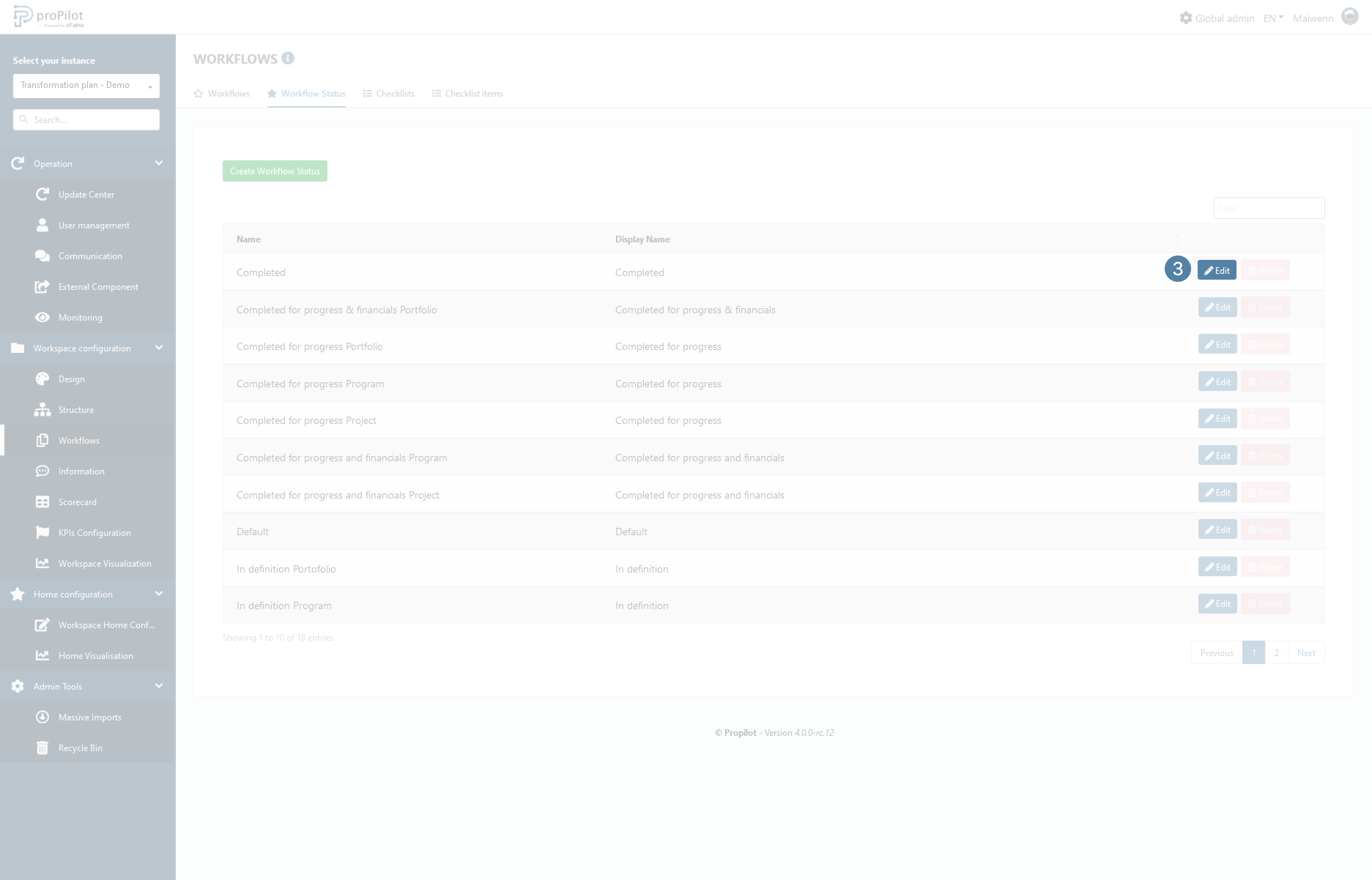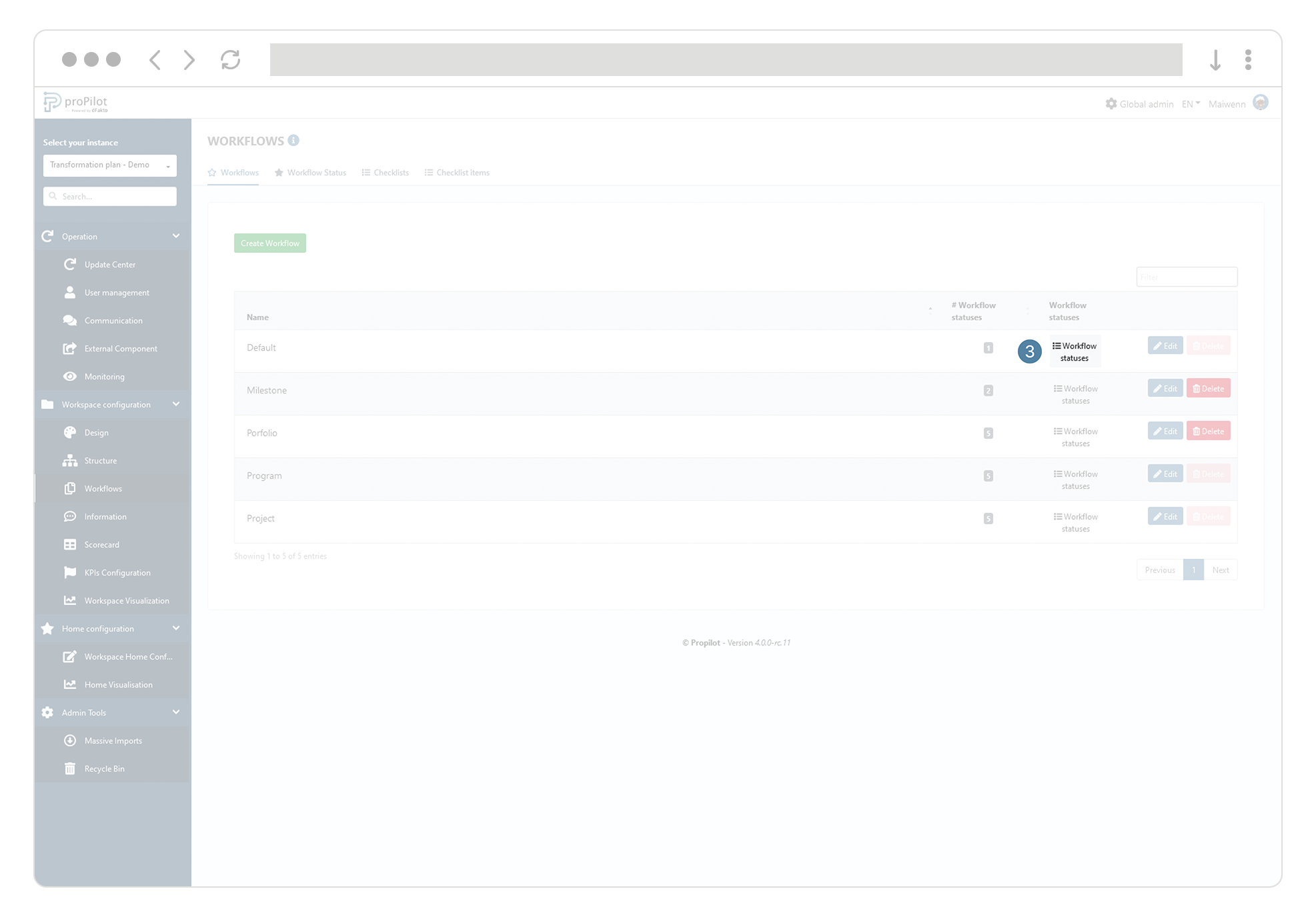 Click on the "Workflow statuses" button of the Workflow for which you wish to enter additional information.