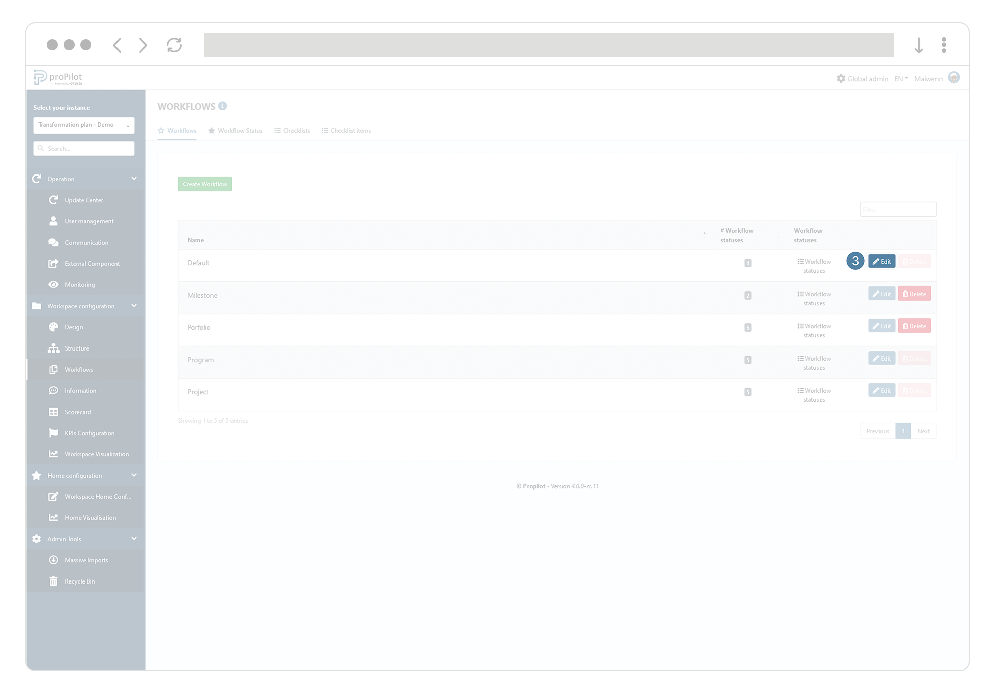 In the left menu of an instance, select "Workspace configuration" then "Workflows".