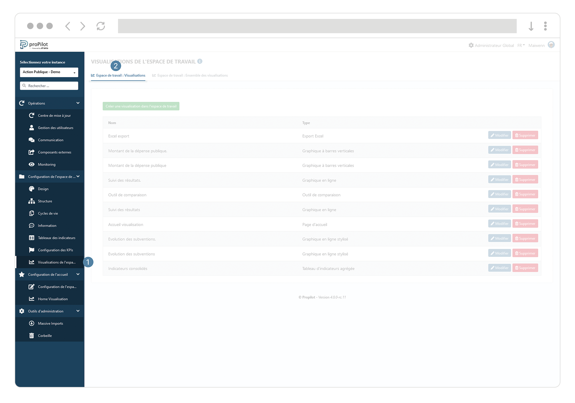 Dans le menu de gauche, sélectionnez “configuration de l'espace de travail” puis “visualisations de l’espace de travail”.