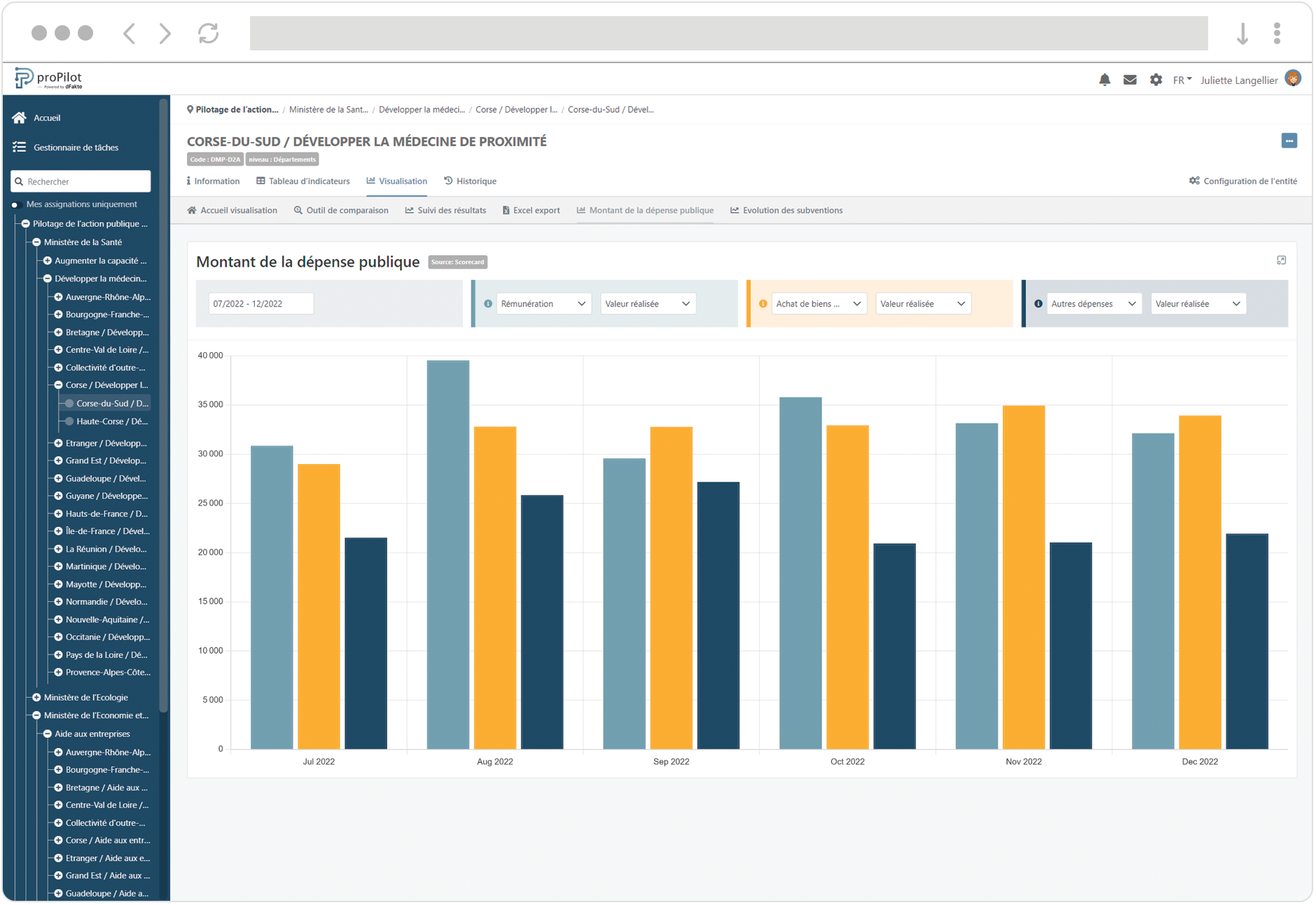 Cette visualisation permet d’afficher les indicateurs collectés dans le tableau d’indicateurs sous forme graphique. Vous pouvez sélectionner la source de données pour afficher les informations du tableau d’indicateurs de l’entité ou alors afficher la consolidation des valeurs associées aux indicateurs si vous vous situez à des niveaux supérieurs dans la hierarchie.