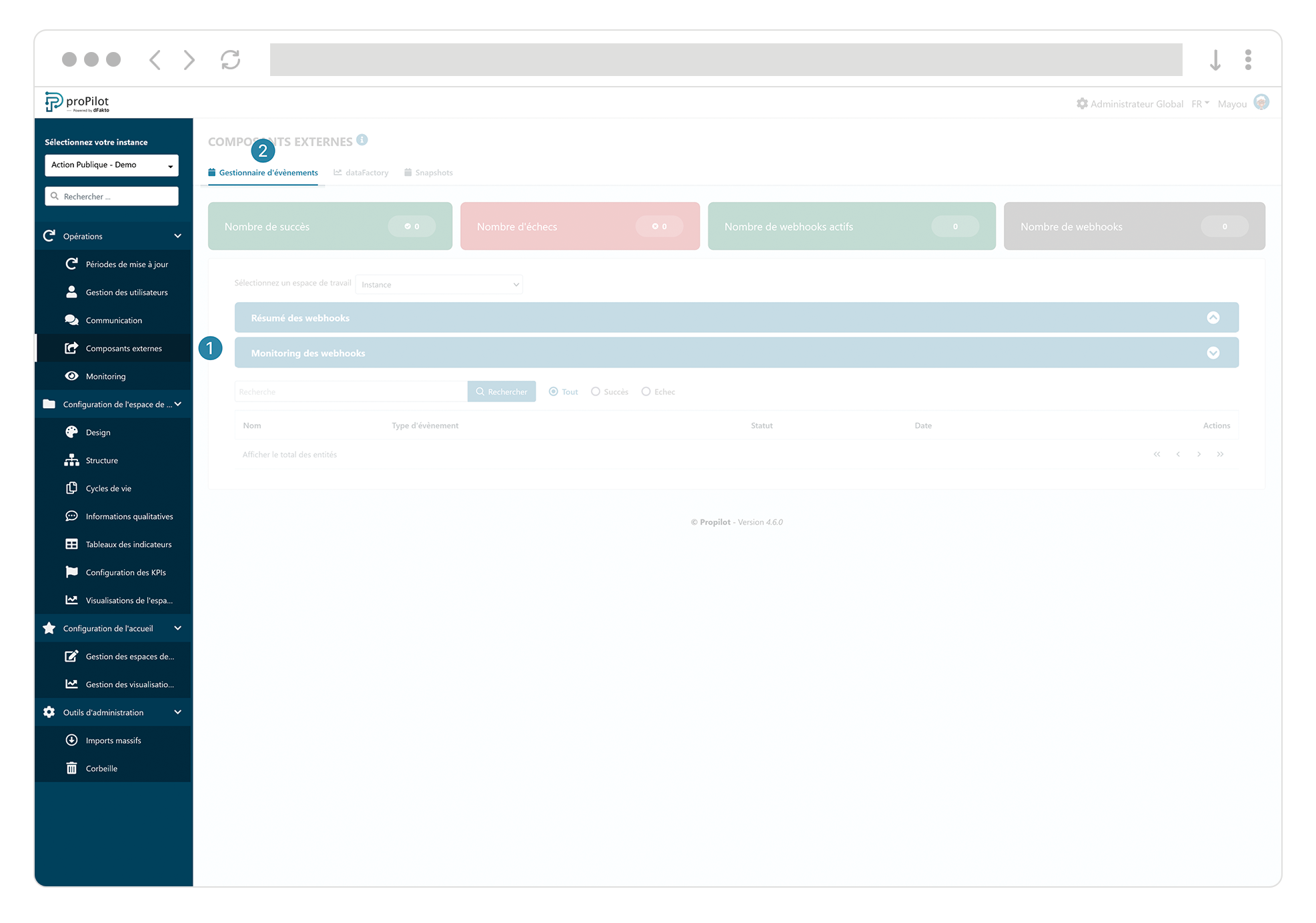 Afin de renvoyer les informations du proPilot vers un système informatique, il est nécessaire de mettre en place les webhooks associés.