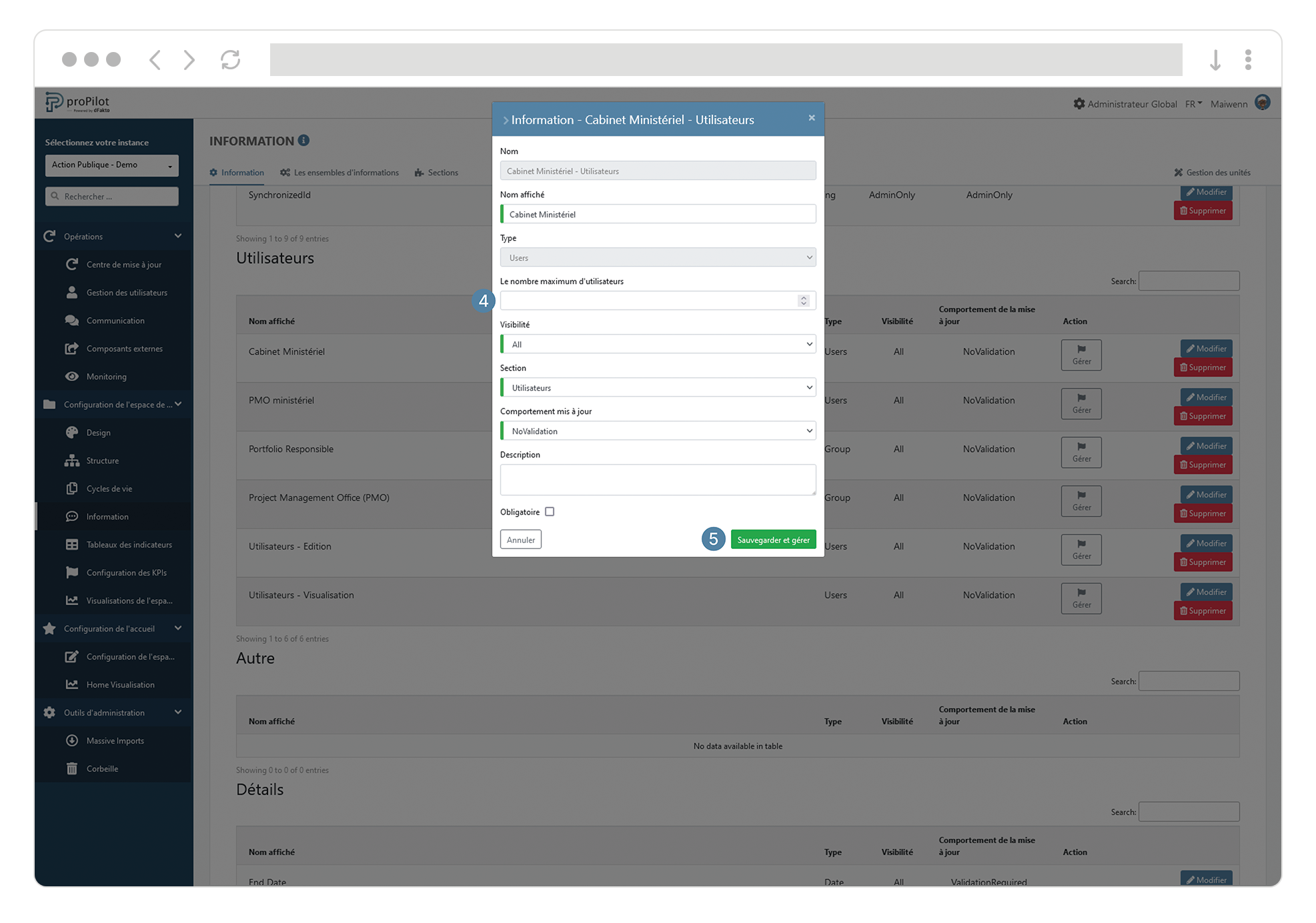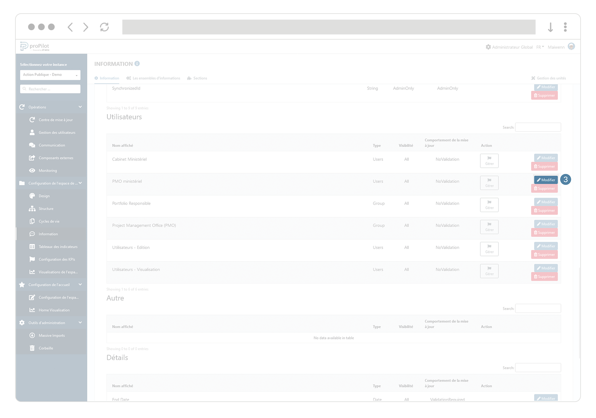Sélectionnez l’information type “utilisateur” concernée et cliquez sur le bouton d’action “gérer” associé.