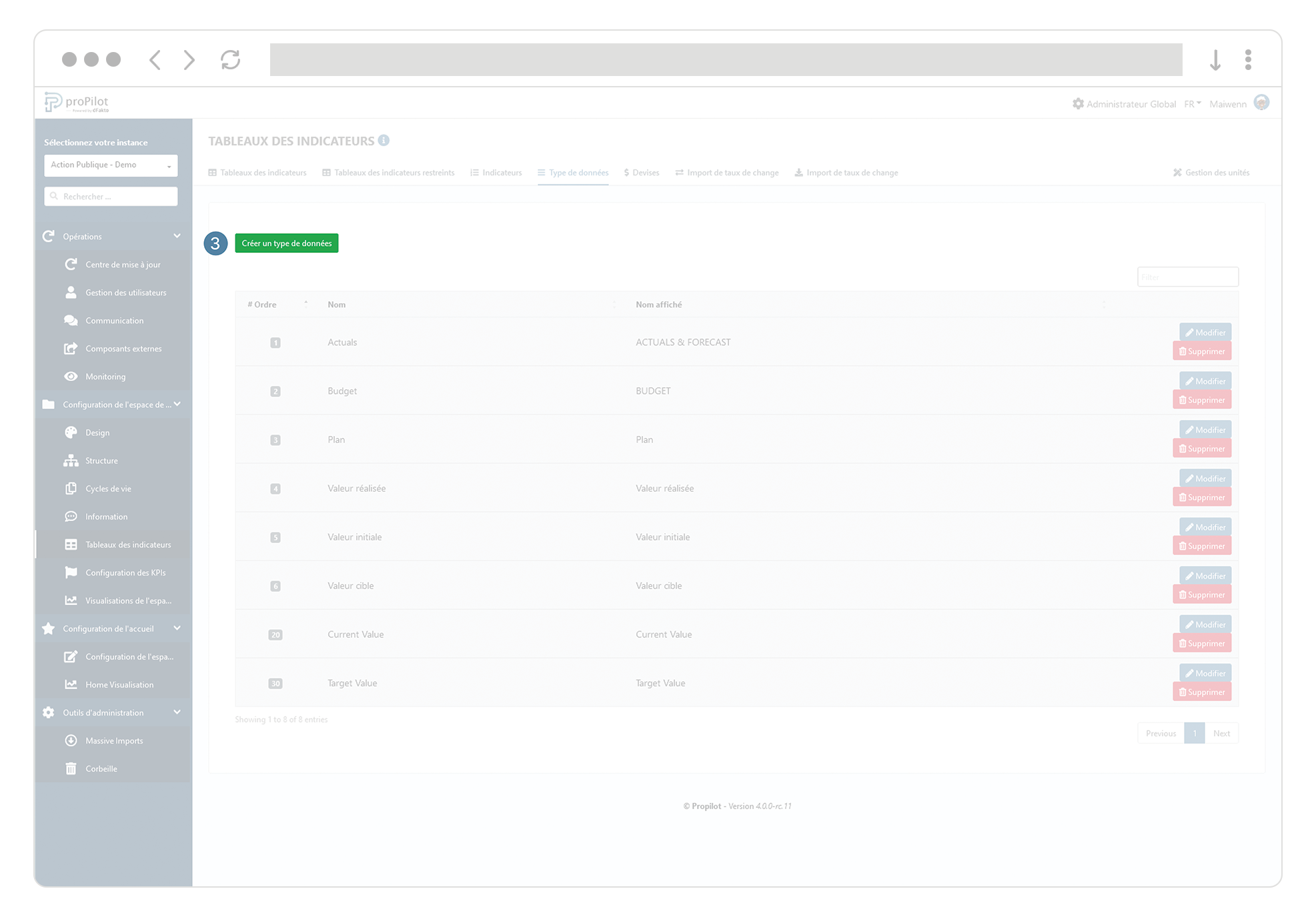 Créez un nouveau type de données que vous souhaitez suivre (valeur actuelle, valeur cible, objectif, budget,…) pour vos indicateurs