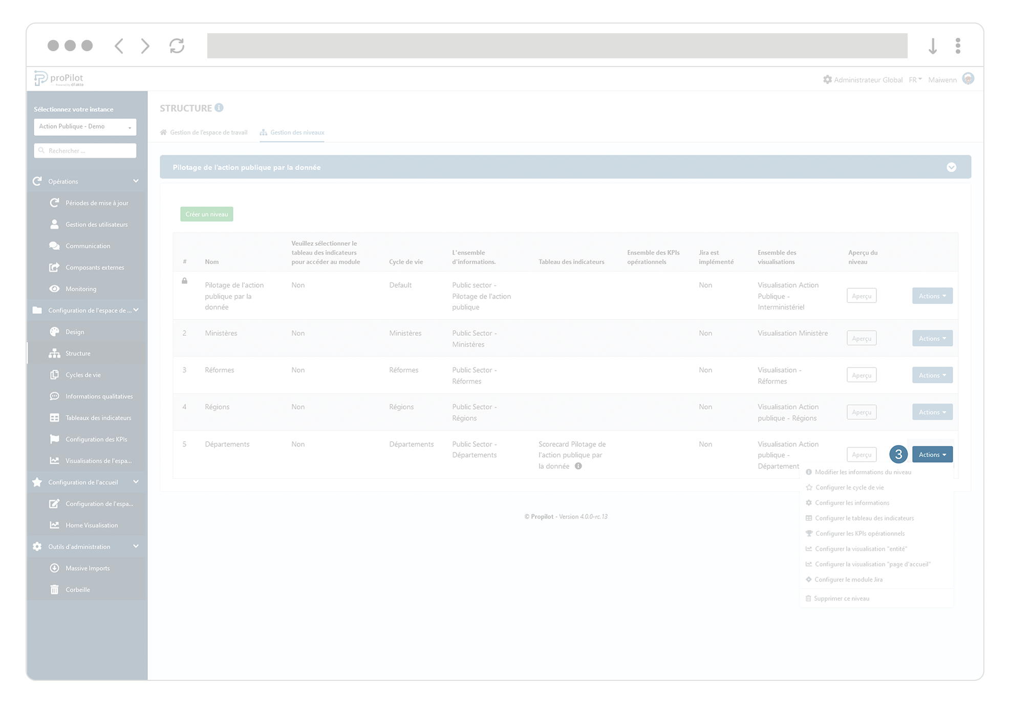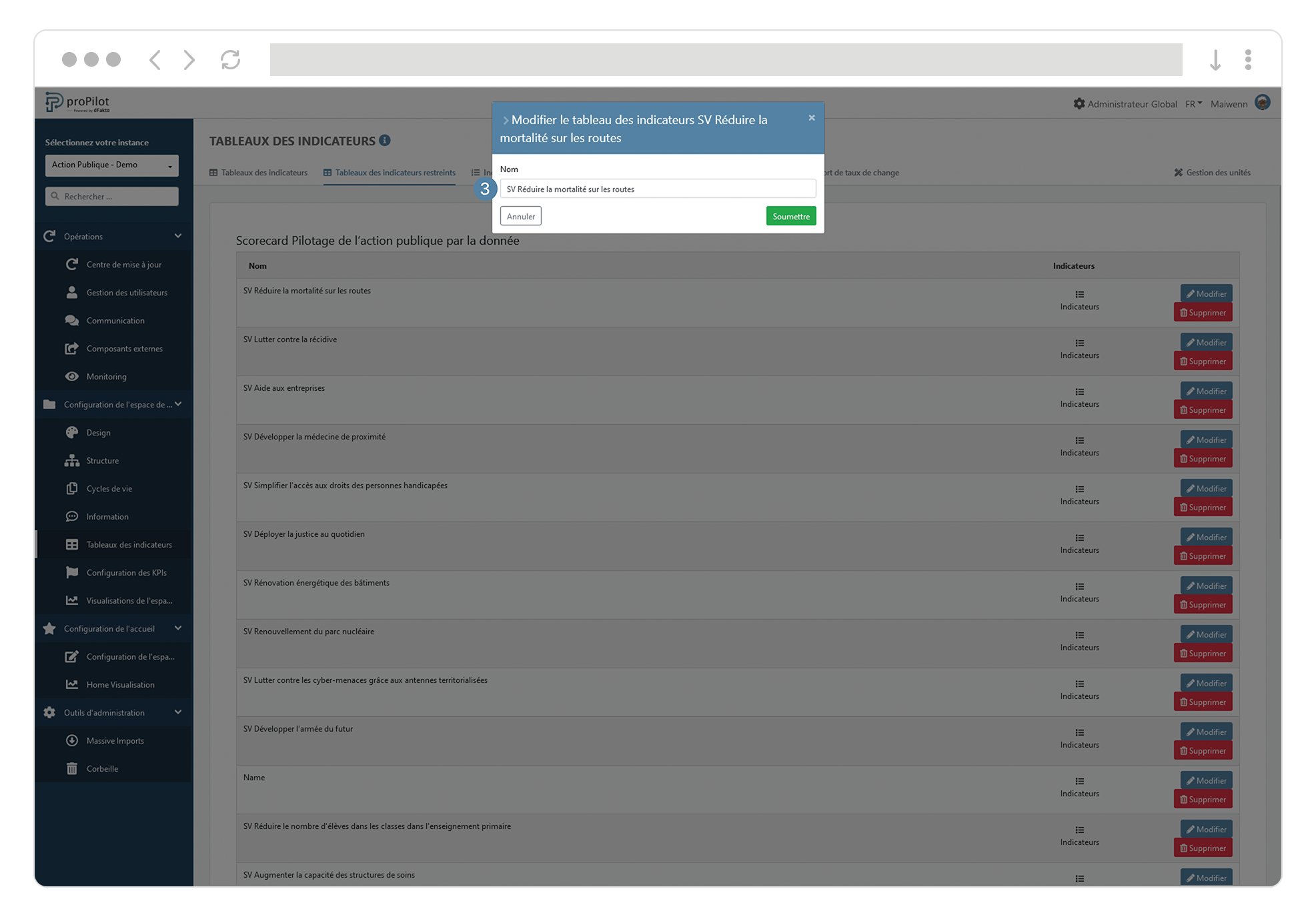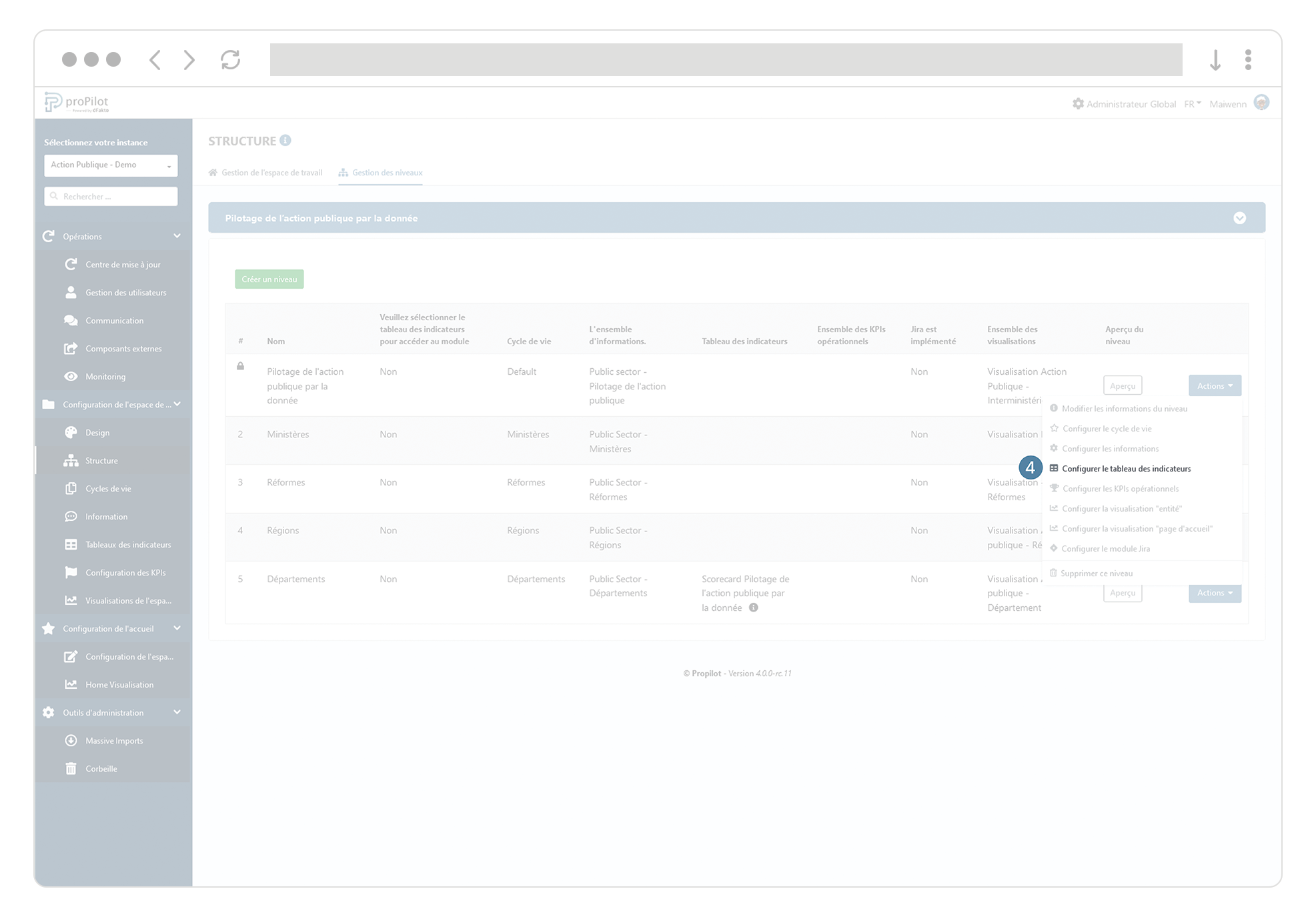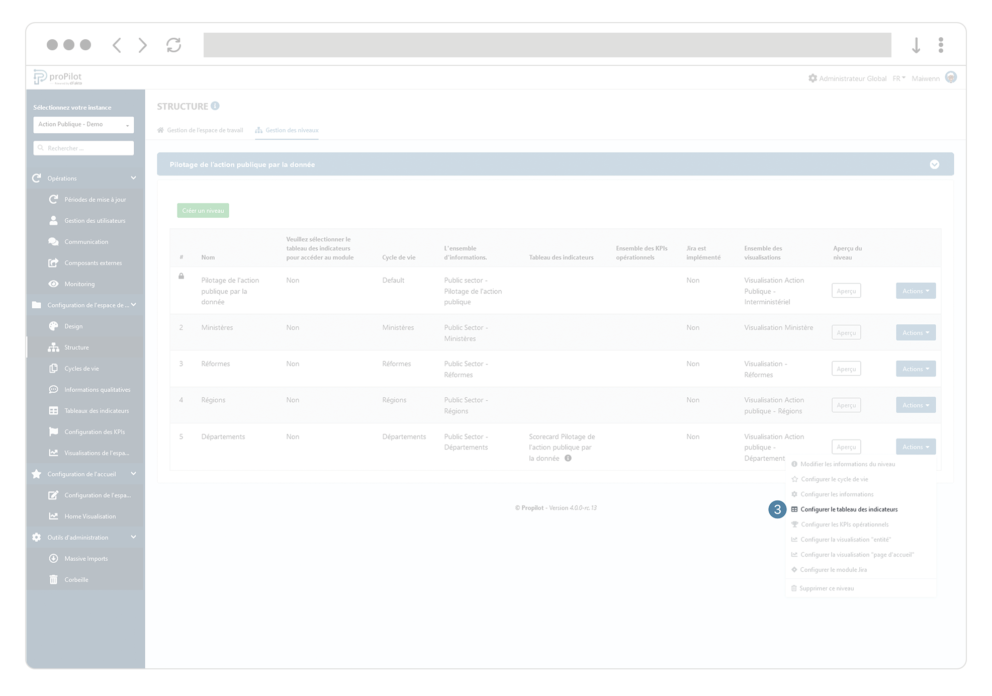 Cliquez sur le bouton “actions” du niveau que vous souhaitez mettre à jour. Puis sélectionner “configurer le tableau des indicateurs” Une fenêtre contextuelle apparaît.