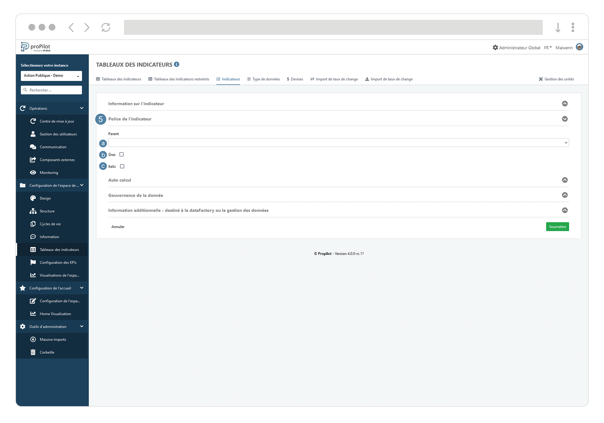Dans la section “police de l'indicateur””, complétez les champs suivants:
