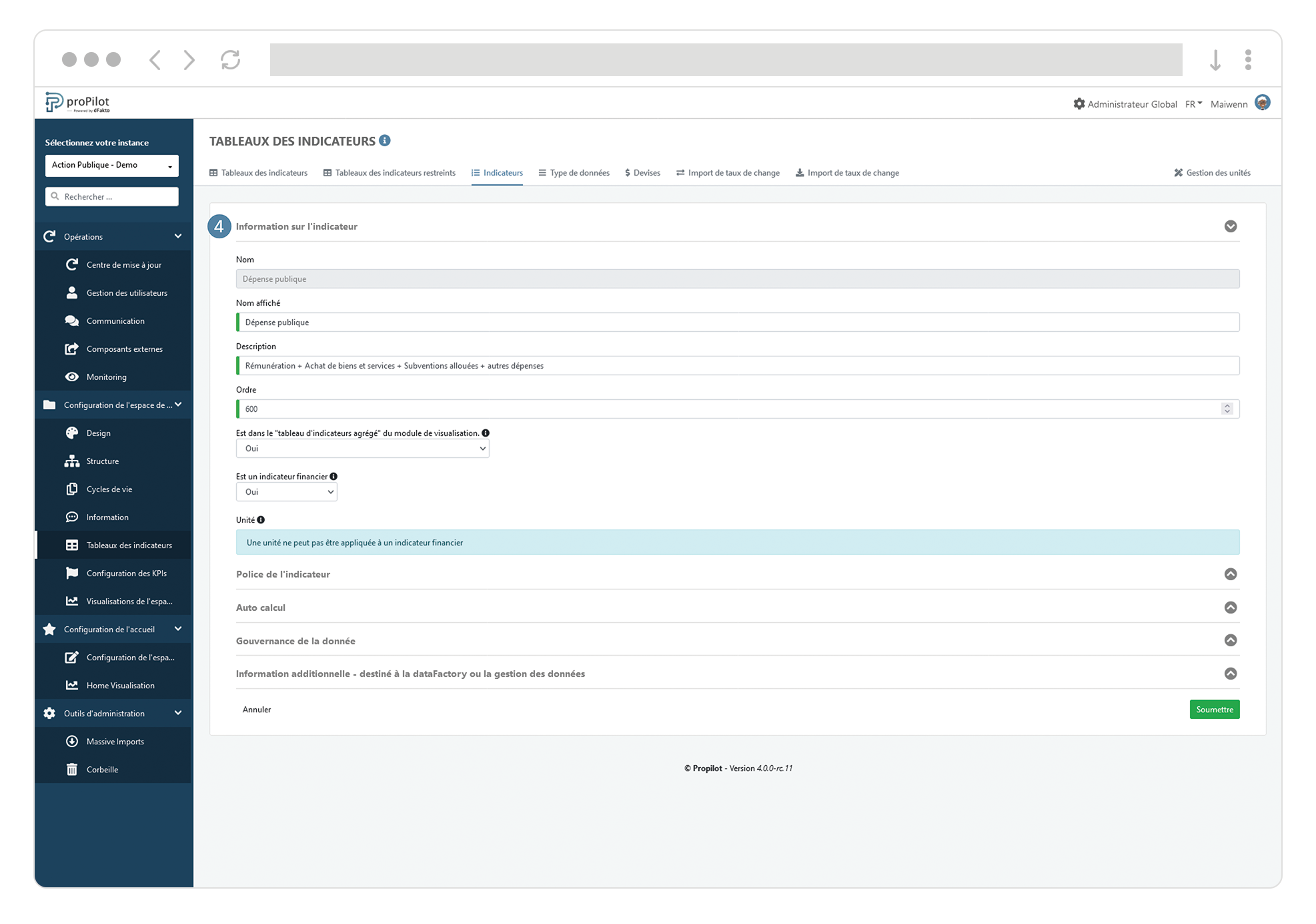 Est dans le “tableau d’indicateurs agrégé” du module de visualisation: oui/non. Si vous sélectionnez oui, l’indicateur sera affiché dans le tableau d’indicateurs agrégé au niveau supérieur.