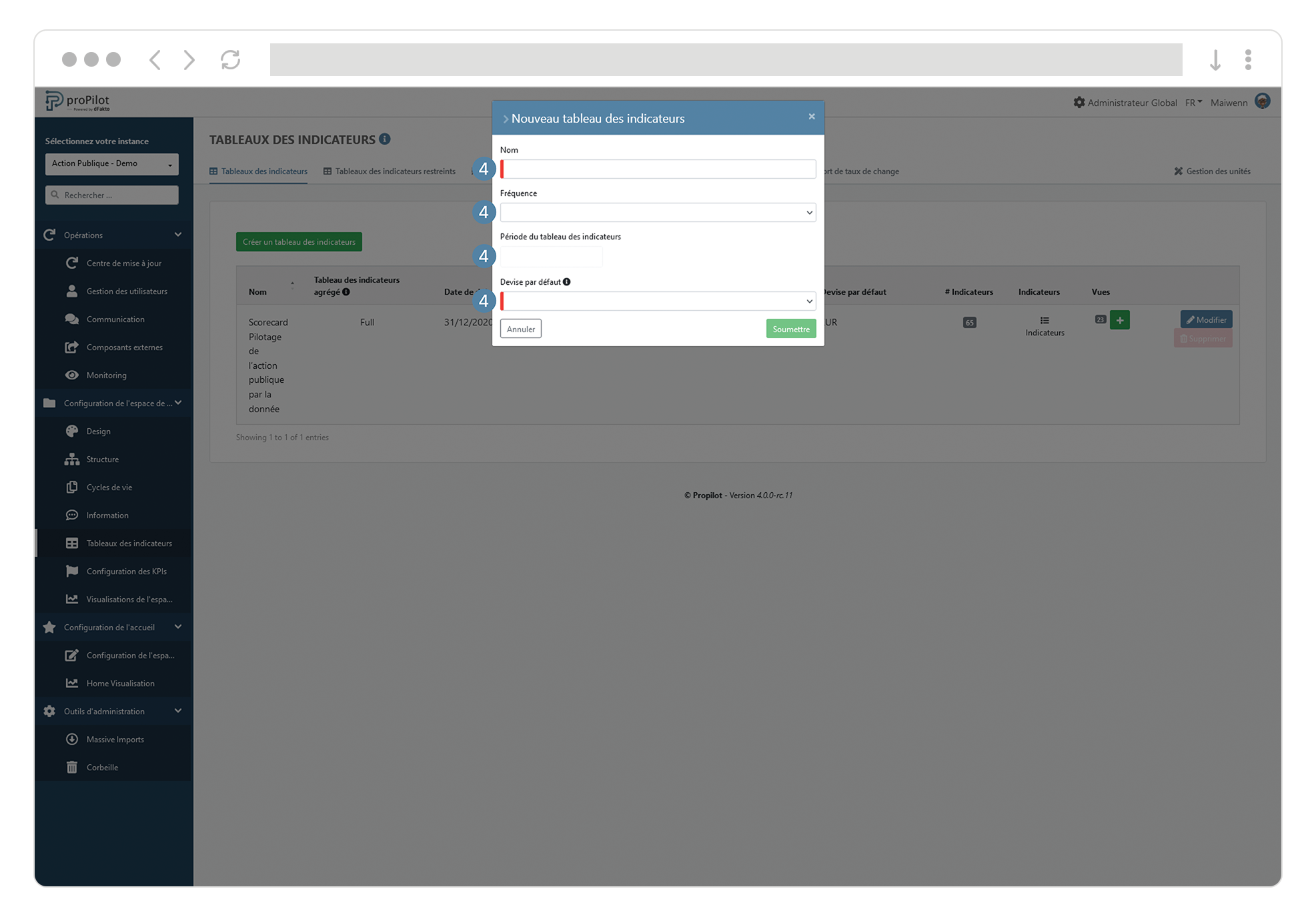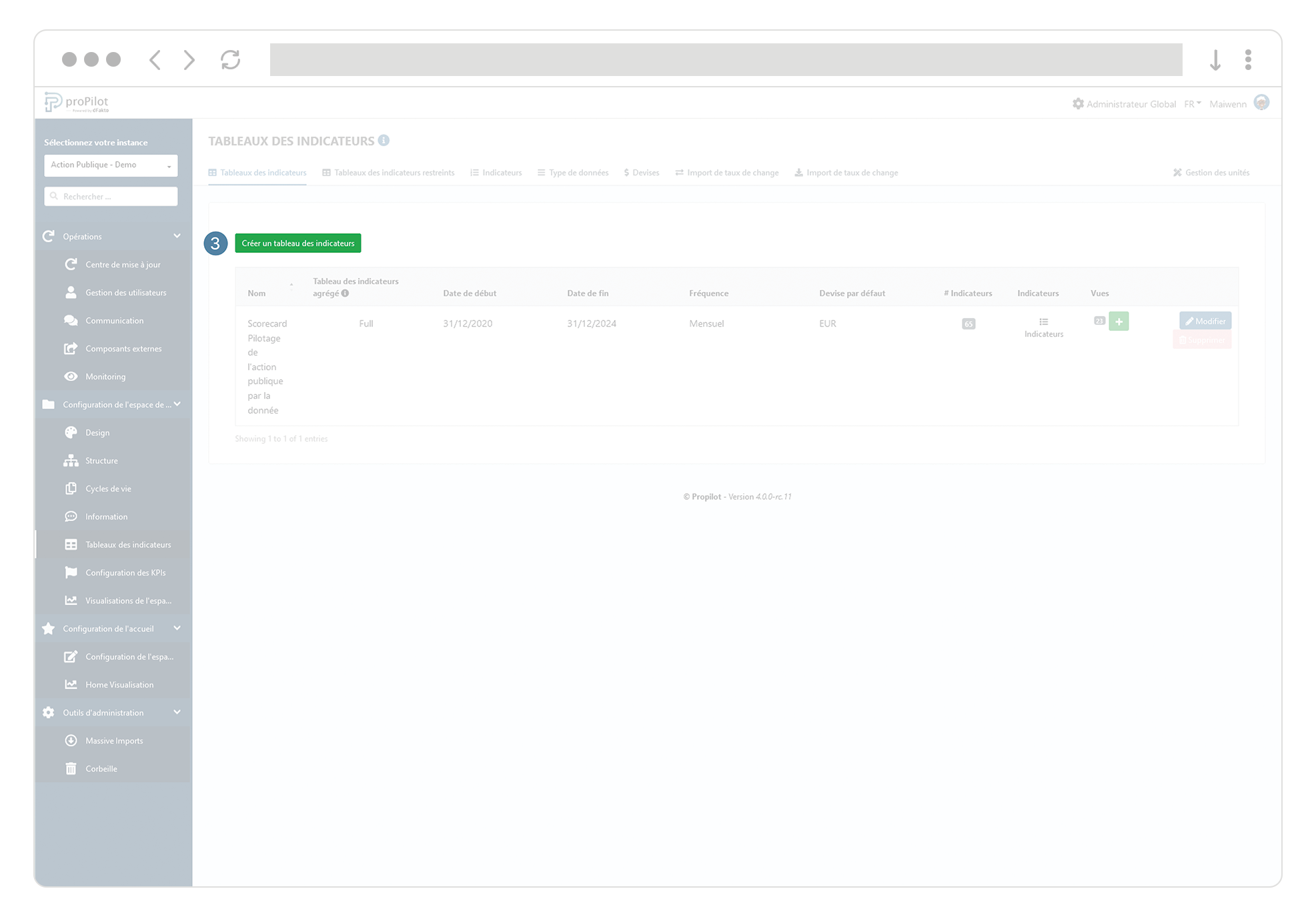 Cliquez sur le bouton “créer un tableau d’indicateurs”. Une fenêtre contextuelle s’ouvre.