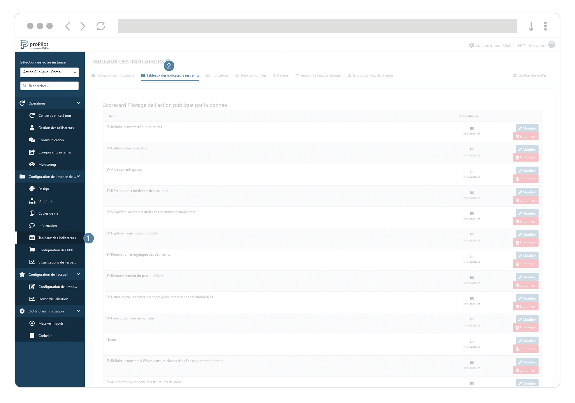 Cliquez sur le bouton “indicateurs” de la vue à laquelle vous souhaitez apporter des modifications. Vous arrivez sur une page affichant tous les indicateurs du tableau.