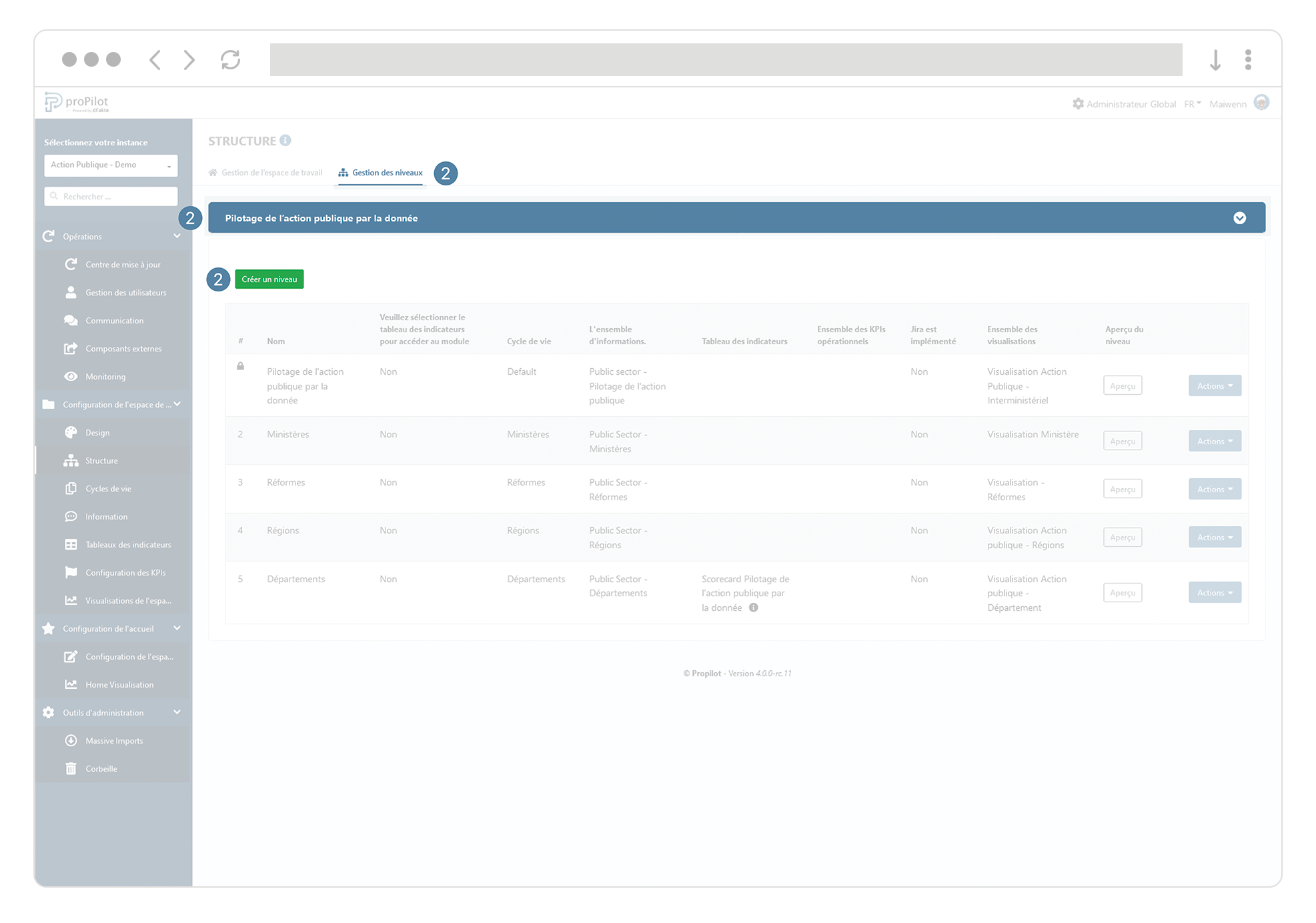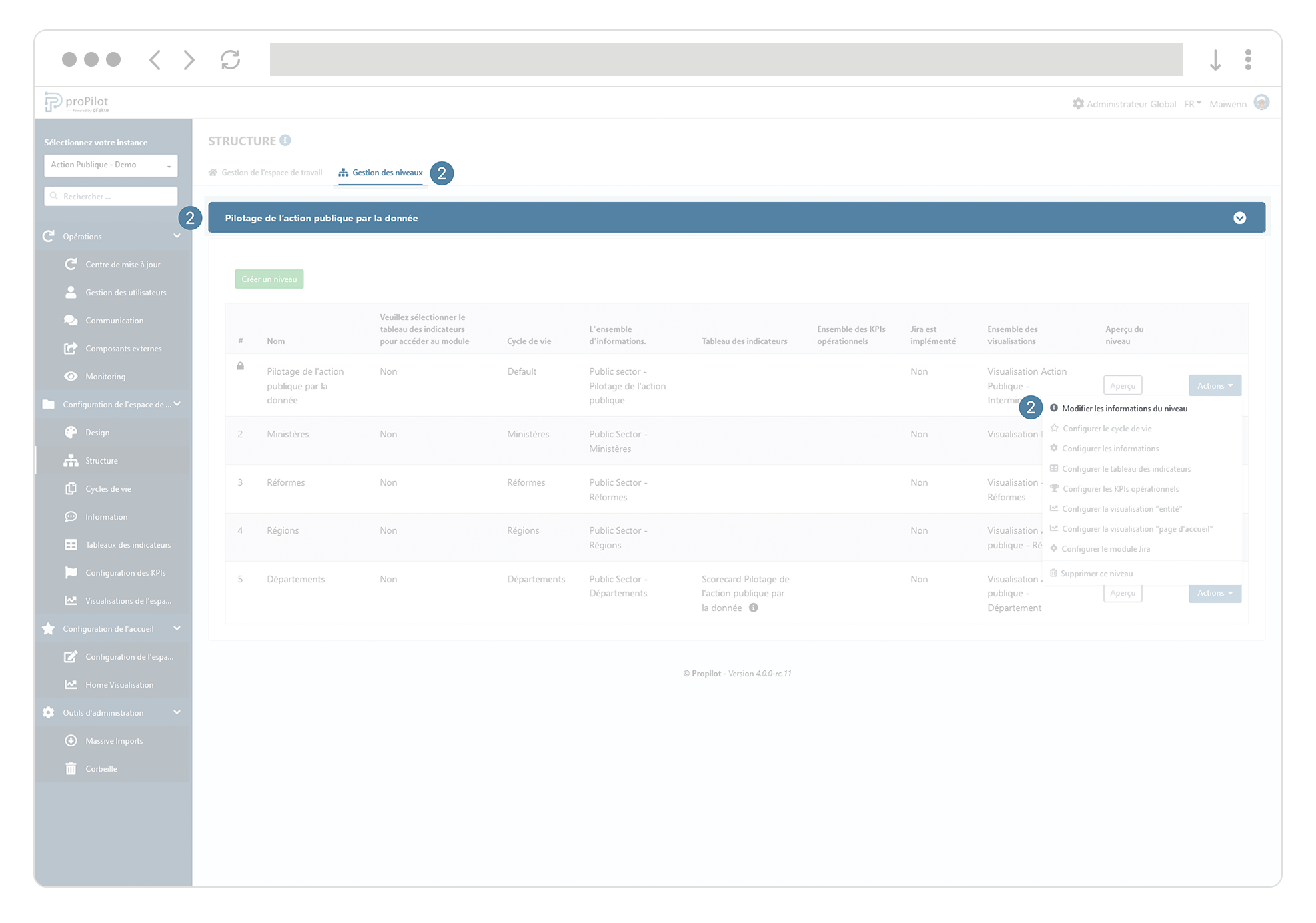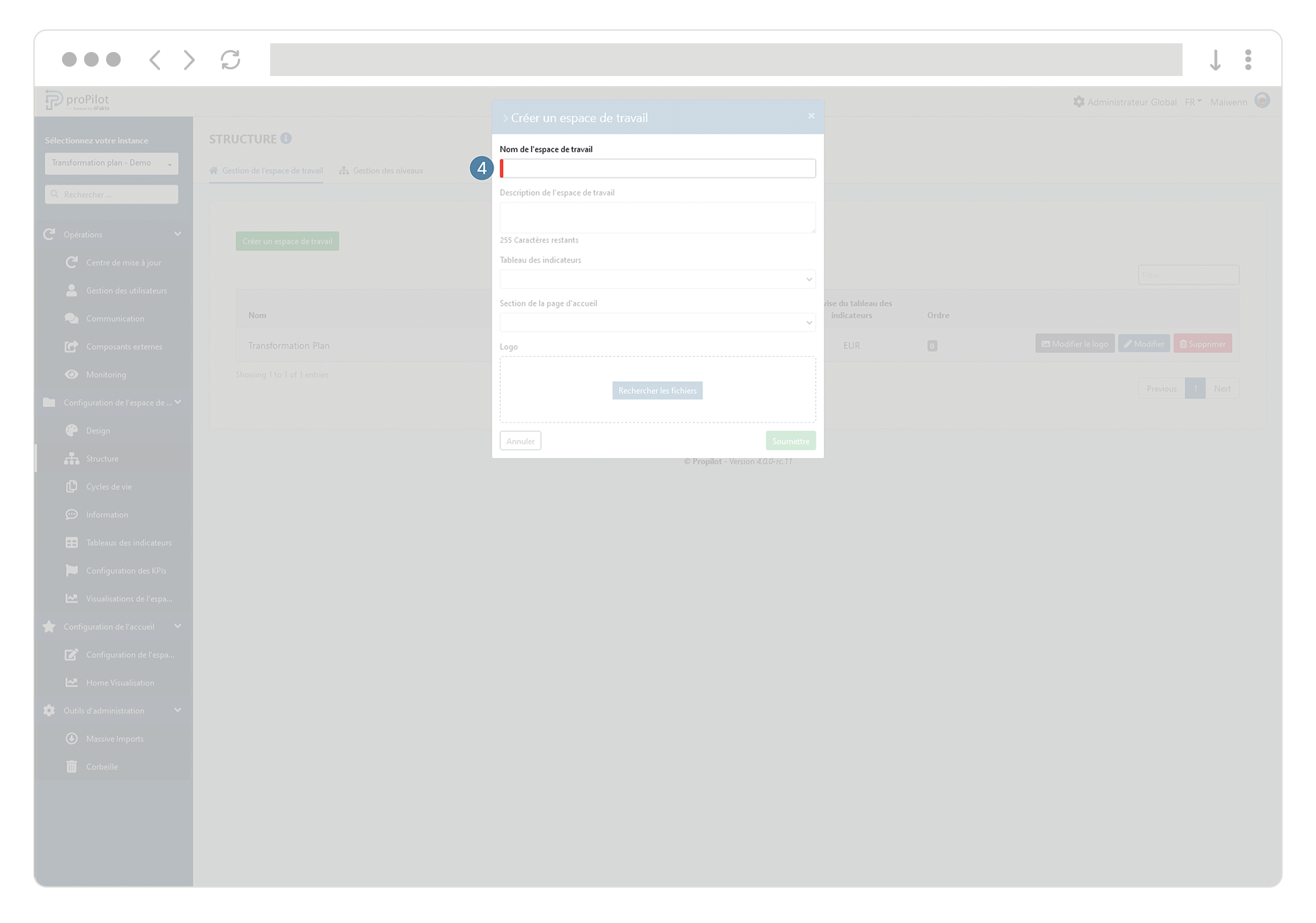 Lorsque vous vous trouvez dans l’administration d'une instance (choisie via le menu déroulant en haut à gauche de l'écran d’administration), ouvrez la partie “Configuration de l’espace de travail” dans le menu de gauche et cliquez ensuite sur l’option “ Structure” de ce menu.