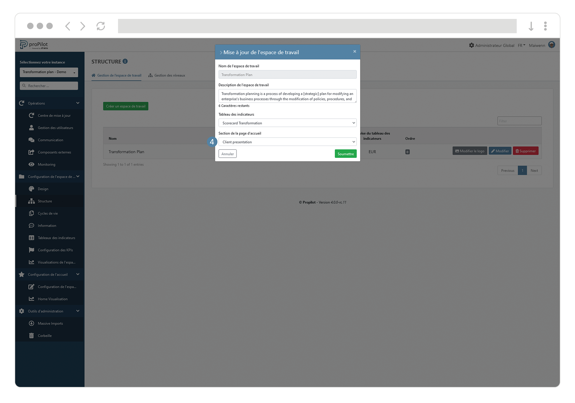 Cliquez sur l’information et mettez à jour sa valeur. Votre espace de travail apparaîtra alors sous ce nouveau nom à tous les endroits du proPilot.
