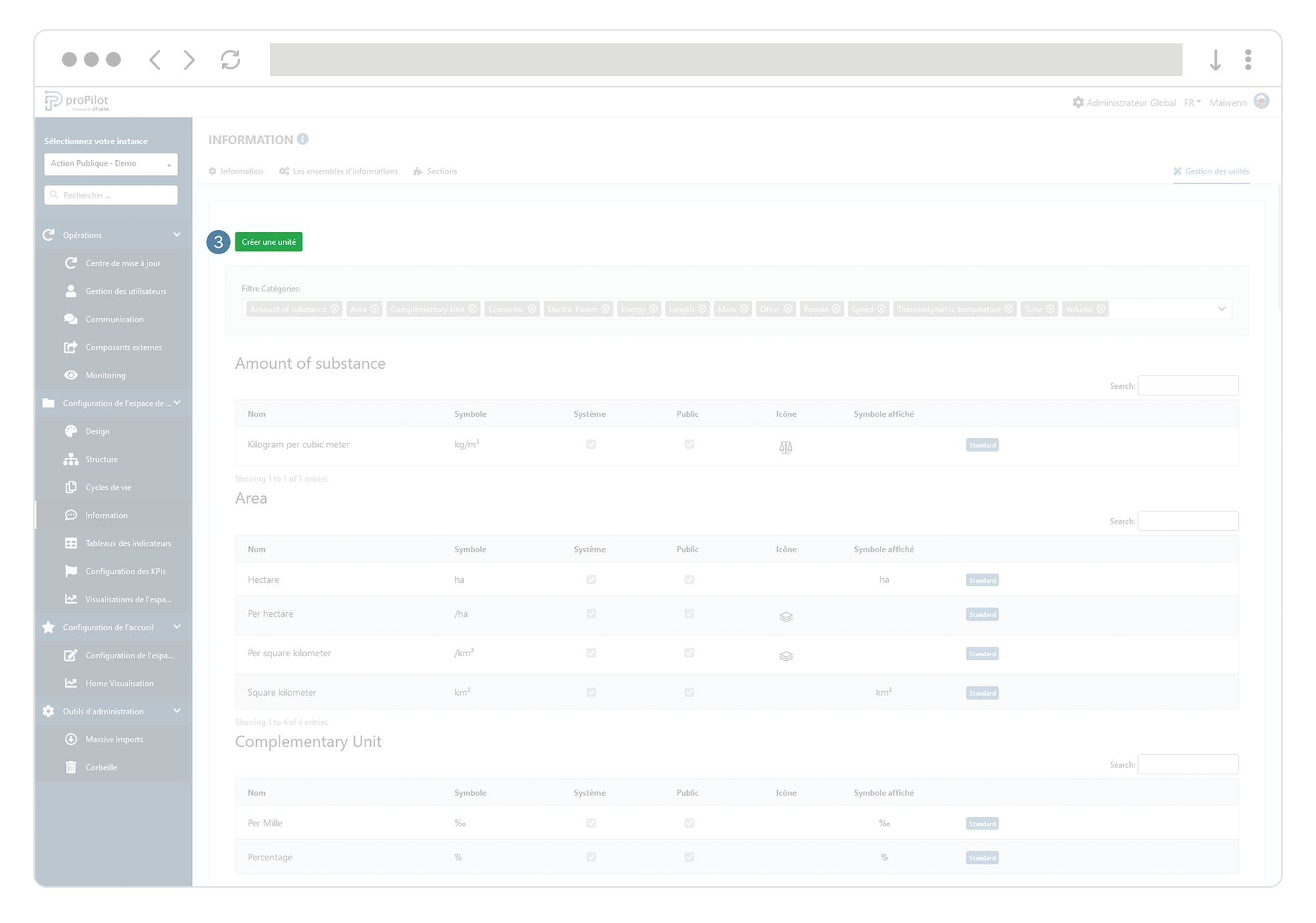 Dans votre espace de travail, vous avez la possibilité de suivre des indicateurs, des informations quantitatives... Chacune de ces valeurs peut être définies par une unité (métrique, économique, écologique, énergétique, distance, capacité,…)